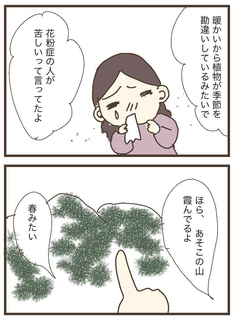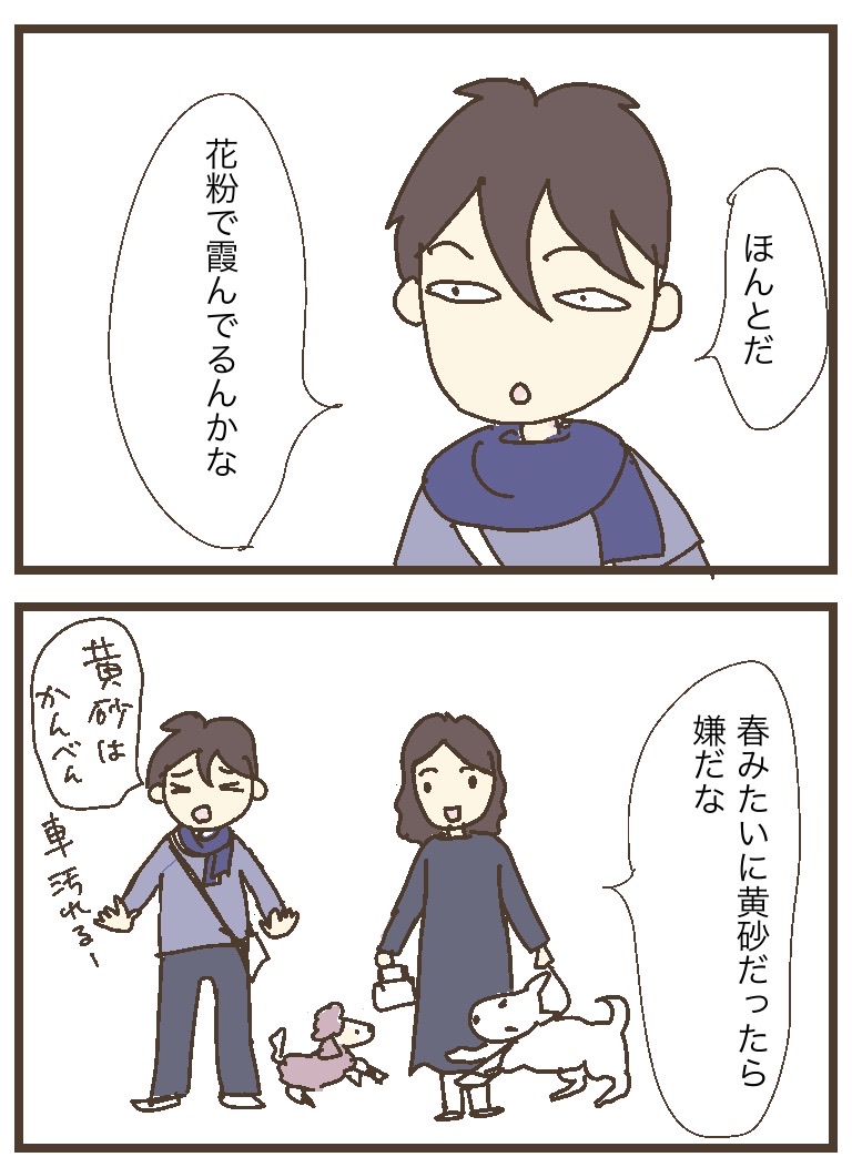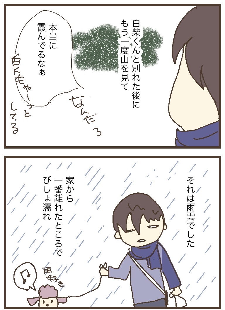 花粉が飛んでる? 2023年11月29日 忘れてたけど岐阜の冬って、晴れてるーって油断していたら突然雨(雪)が降るんだった。岐阜の冬は、西の方が暗い雲に覆われています。遠くの山(西側)がもやーっとしていたのは、雨が降っていたからだったみたいです。自分の真上の空から東側はスカッと青空だったので、油断していました。もちゃは雨が降ると(わざと?)ゆっくり歩くので、びしょ濡れになりました。 < 前の記事次の記事 > コメント コメントフォーム 名前 コメント 記事の評価 リセット リセット 顔 星 情報を記憶 コメントを投稿する