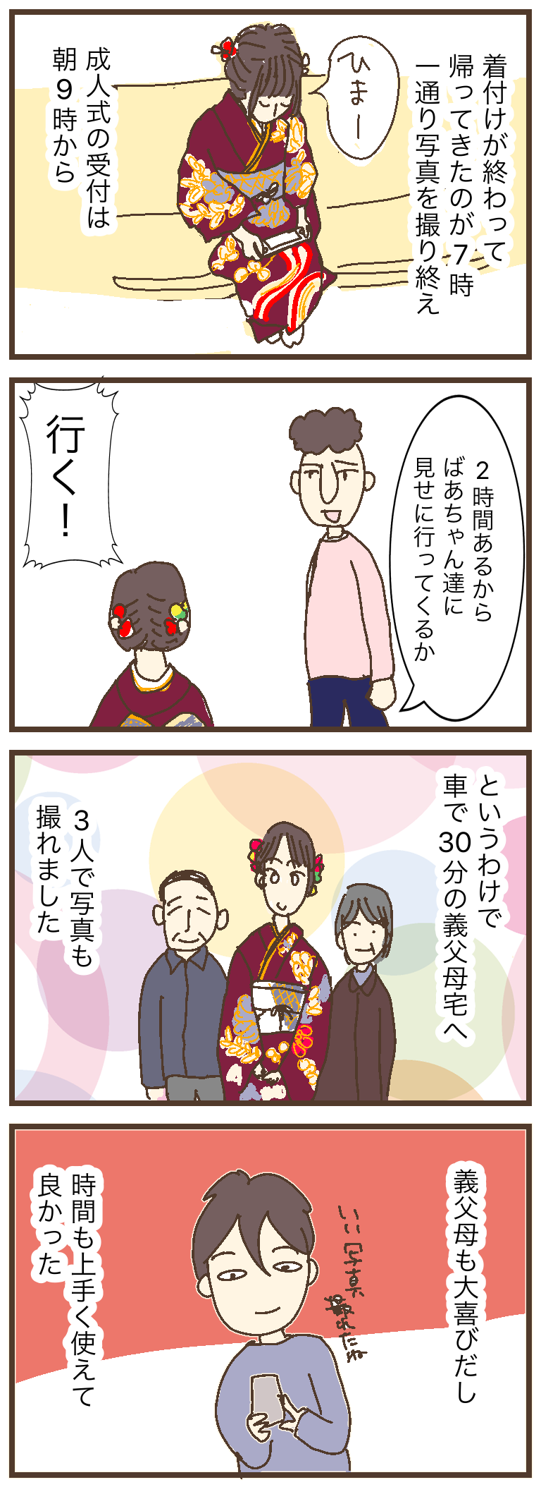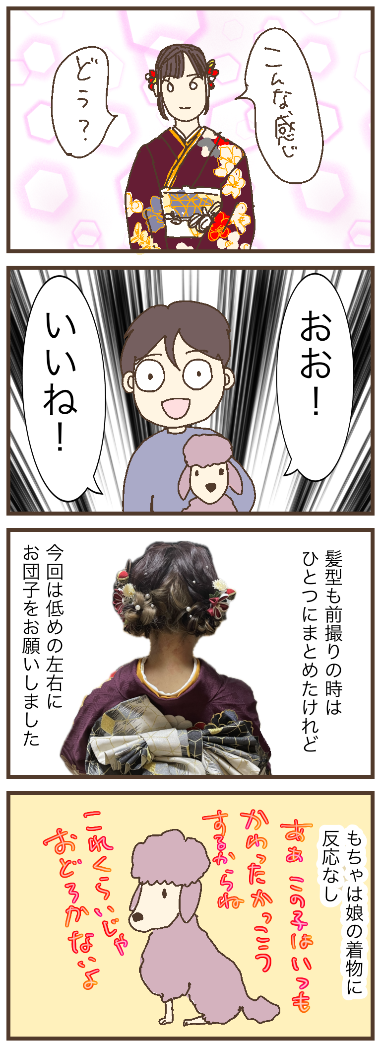 空いた2時間どうしよう(成人式③) 2024年01月12日 前回からの続きです シリーズを最初から もちゃは服装に敏感なので、娘の着物姿に吠えるかと思っていたのですが、いつも通りでした。着付けの予約を取ったのが10ヶ月前とやや遅かったので、空いていたのが5時からしかありませんでした。というか、10ヶ月前で遅いって、いつから予約してるんだろ着付けが終わってから2時間どうしようかと思っていたのですが、成人式が終わって午後から義父母宅に行く予定っだったのを早めて朝に行ってきました。早起きの義父母にとってもちょうど良い時間でよかったです。続きはこちら < 前の記事次の記事 > コメント コメントフォーム 名前 コメント 記事の評価 リセット リセット 顔 星 情報を記憶 コメントを投稿する